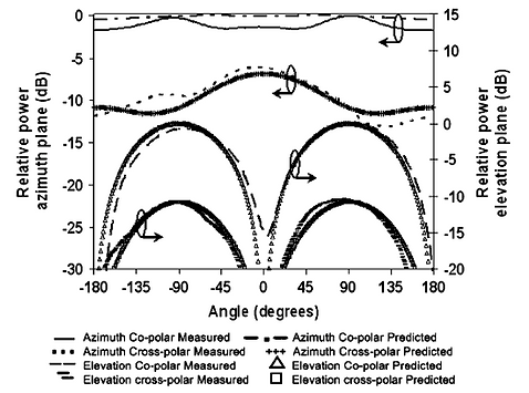 Predicted and measured relative power plots in azimuth and elevation planes for side-fed bifilar with turn angle 230 .