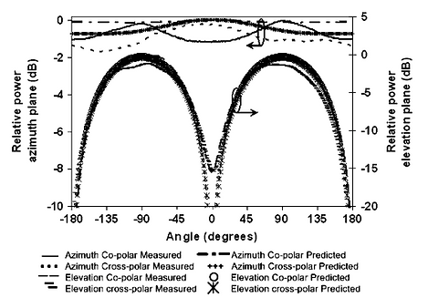 Predicted and measured relative power plots in azimuth and elevation planes for side-fed bifilar with turn angle 180.