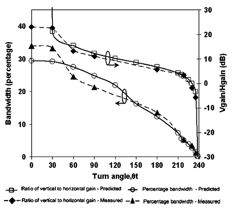 Predicted and measured percentage bandwidth and ratio of vertical to horizontal gain of side-fed bifilar helix antenna versus turn angle.