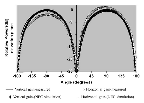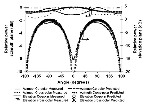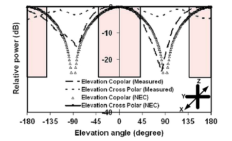 Measured and simulated radiation patterns of crossed dipole in XZ plane at resonant frequency.